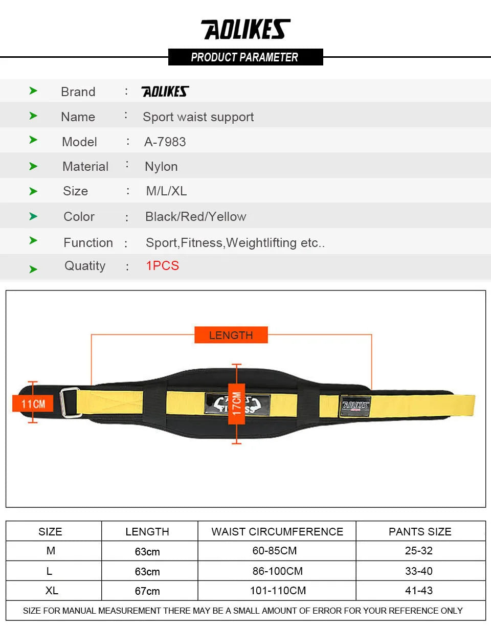 Cinto de levantamento de peso Aolikes modelo 7983 em nylon durável. Proporciona suporte lombar essencial durante treinos intensos de musculação. Apropriado para maiores de 13 anos, sem componentes químicos prejudiciais à saúde.